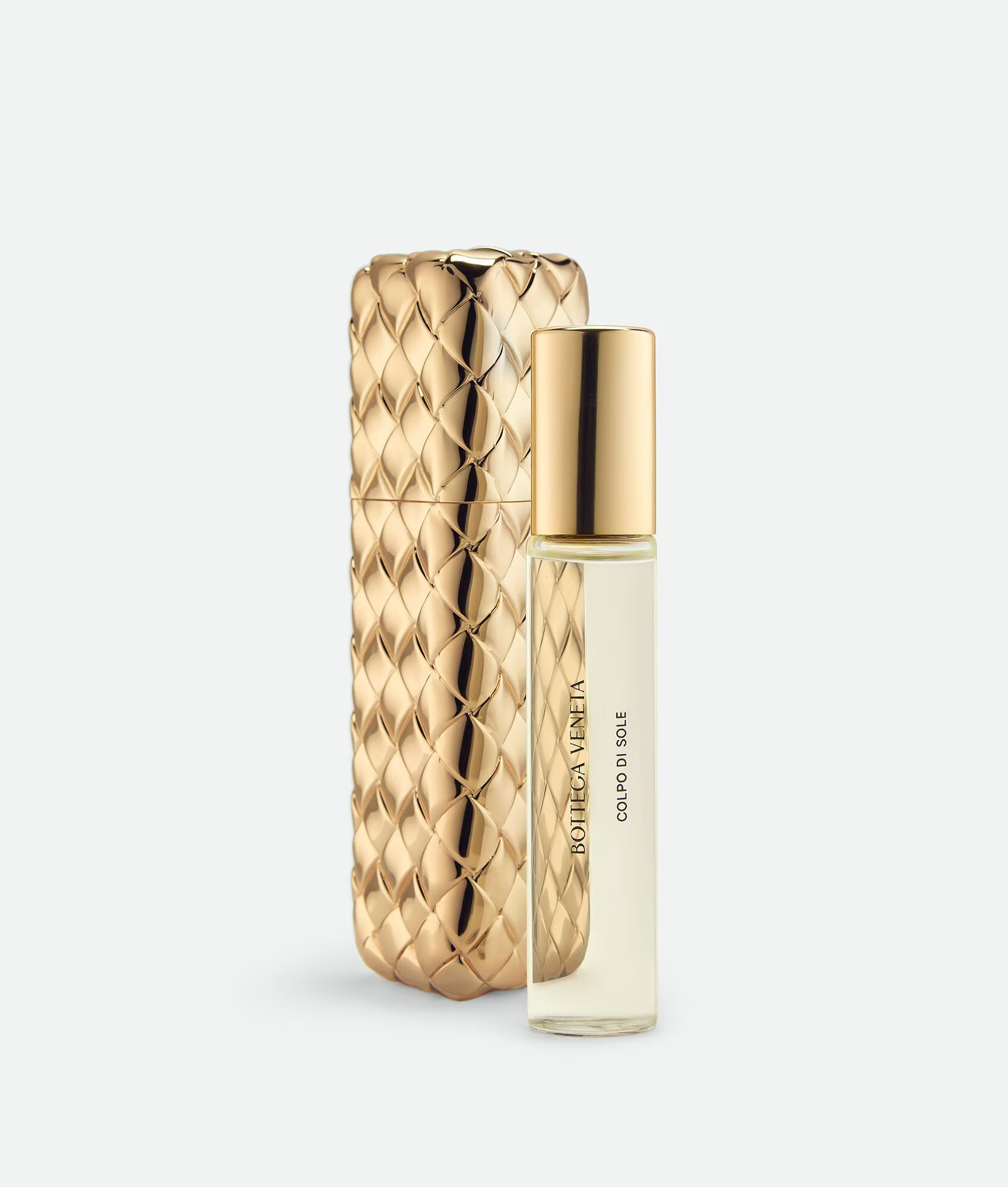 Travel set содержит многоразовый футляр с золотистой отделкой и фирменным мотивом Intreccio, дорожный флакон Colpo di Sole объемом 15 мл и пустой запасной флакон, который можно использовать с любым сменным блоком Bottega Veneta на ваш выбор.
