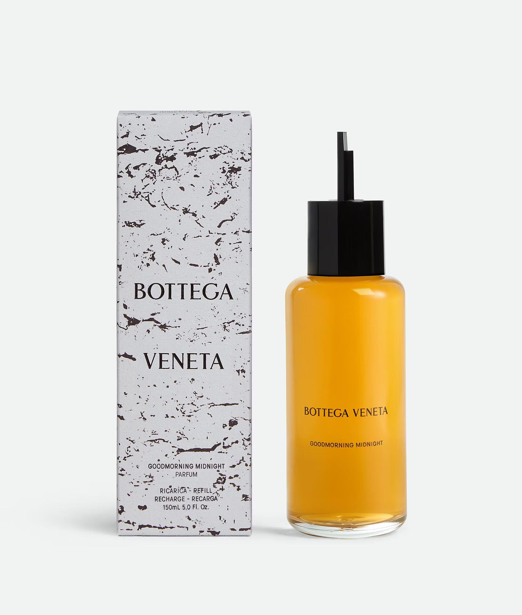 Travel set содержит футляр с золотистой отделкой и фирменным мотивом Intreccio, дорожный флакон Good Morning Midnight объемом 15 мл и пустой запасной флакон, который можно использовать с любым сменным блоком Bottega Veneta на ваш выбор.