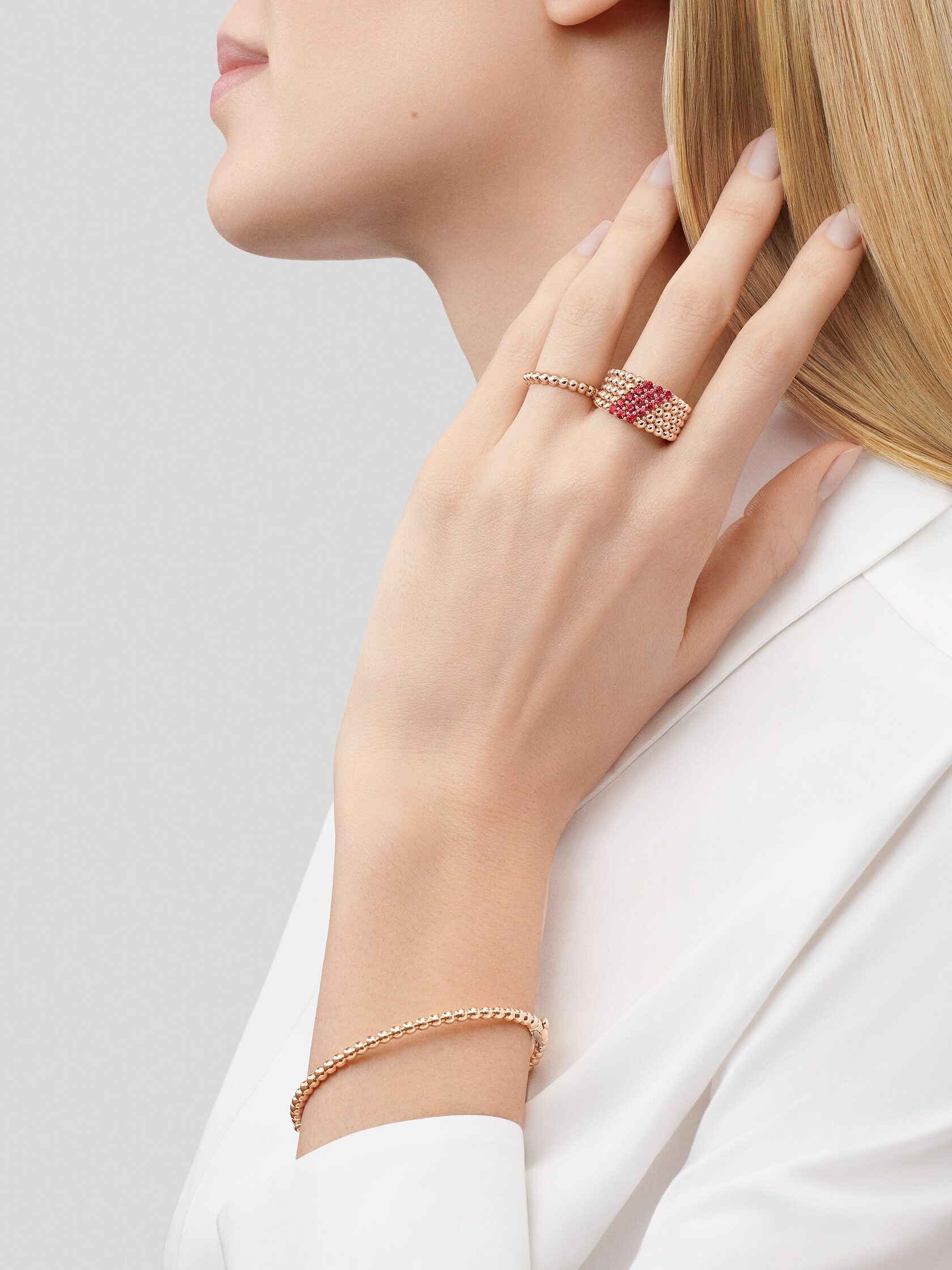 Знаменитое обрамление в виде бусинок в украшениях Perlee поражает многообразием форм и вариантов: от простой линии окантовки до нескольких рядов бусинок из желтого золота 18 карат, белого золота 18 карат с родиевым покрытием или розового золота 18 карат.
