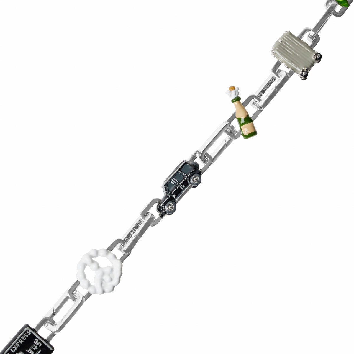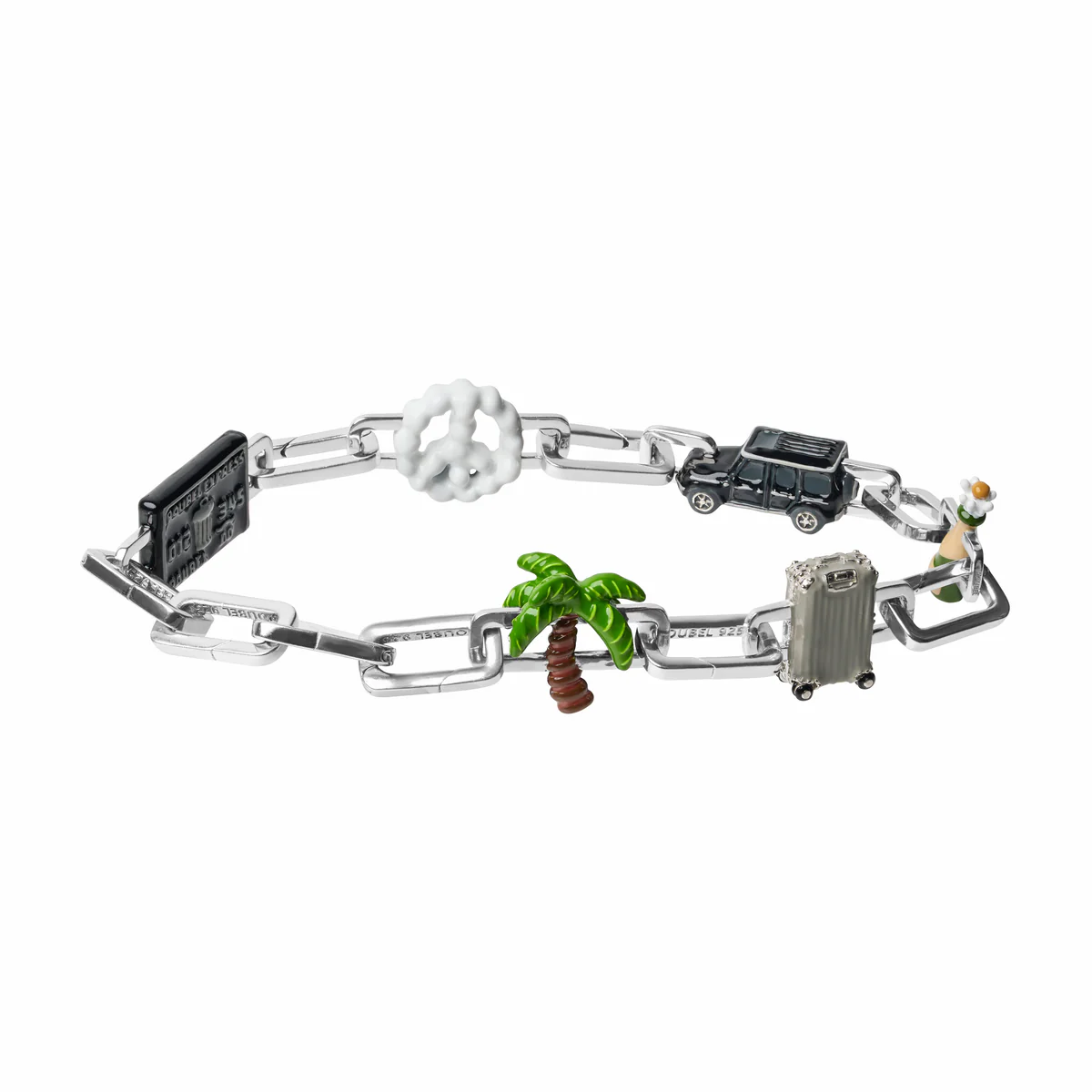 Звенья Poubel изготовлены из переработанного, покрытого родием стерлингового серебра, состоящего на 92,5% из чистого серебра и на 7,5% из других металлов. Добавление других металлов делает цепочку более прочной, не влияя при этом на цвет или блеск.