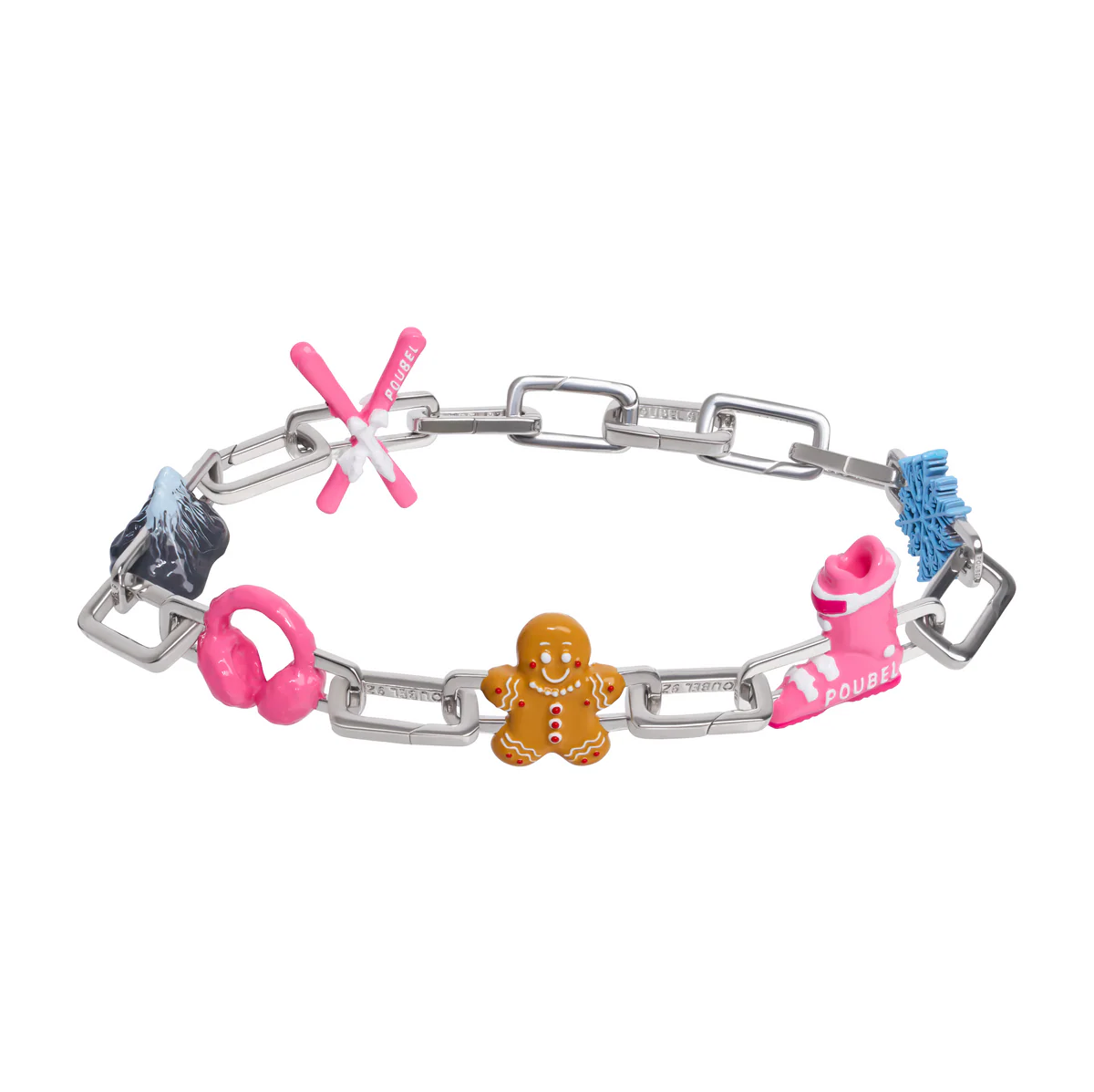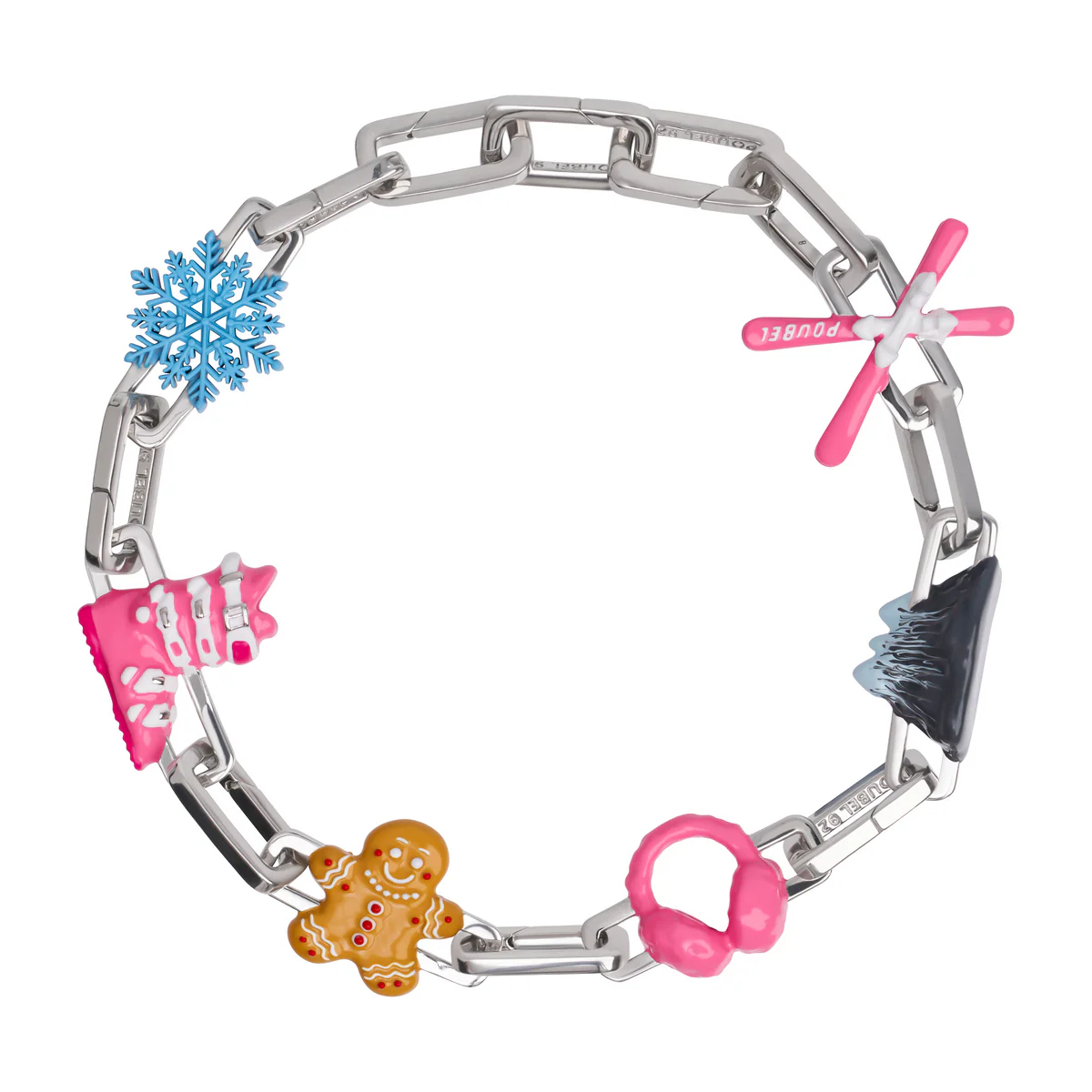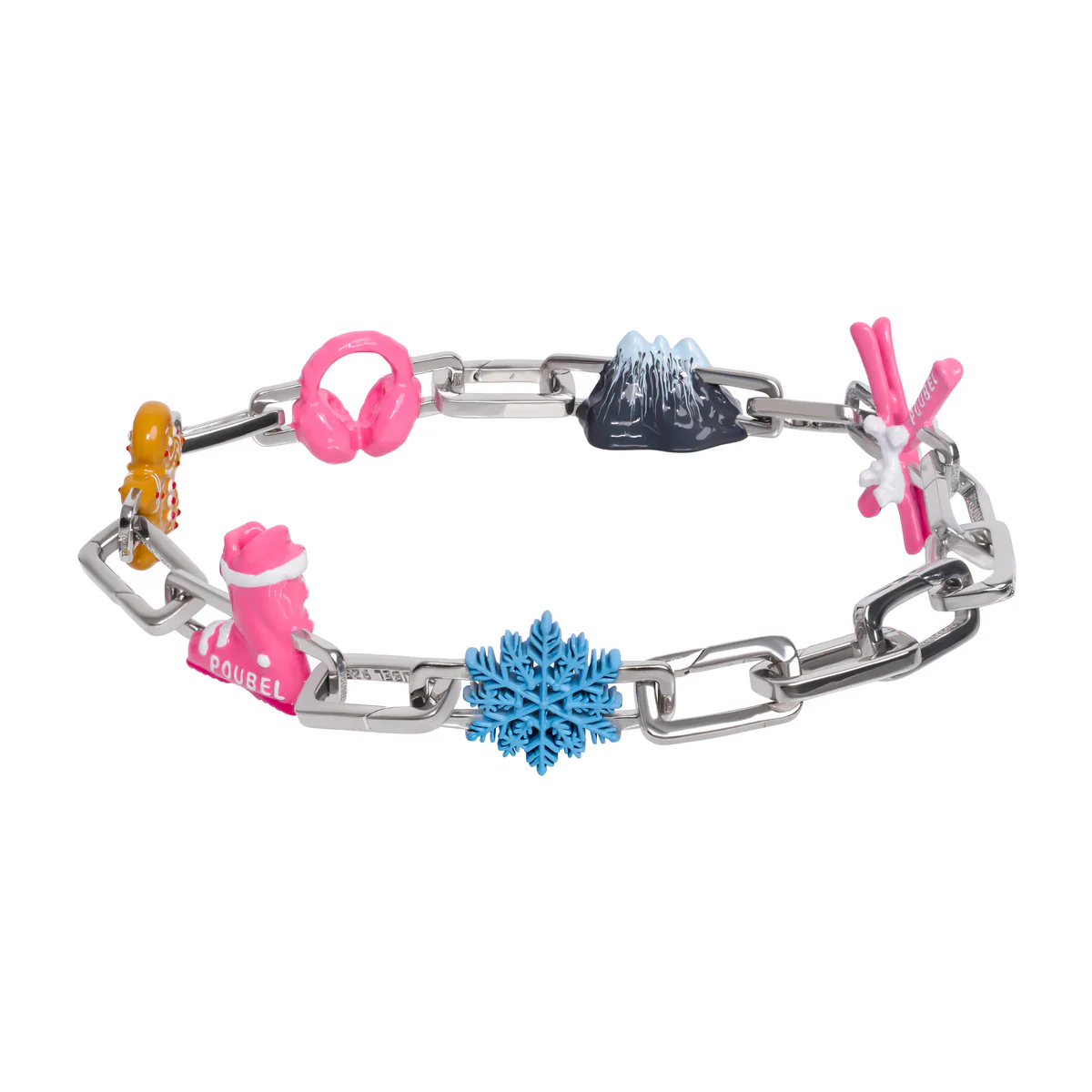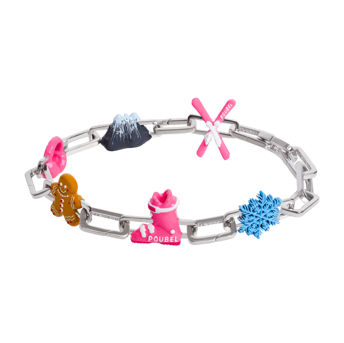 Звенья Poubel изготовлены из переработанного, покрытого родием стерлингового серебра, состоящего на 92,5% из чистого серебра и на 7,5% из других металлов. Добавление других металлов делает цепочку более прочной, не влияя при этом на цвет или блеск.