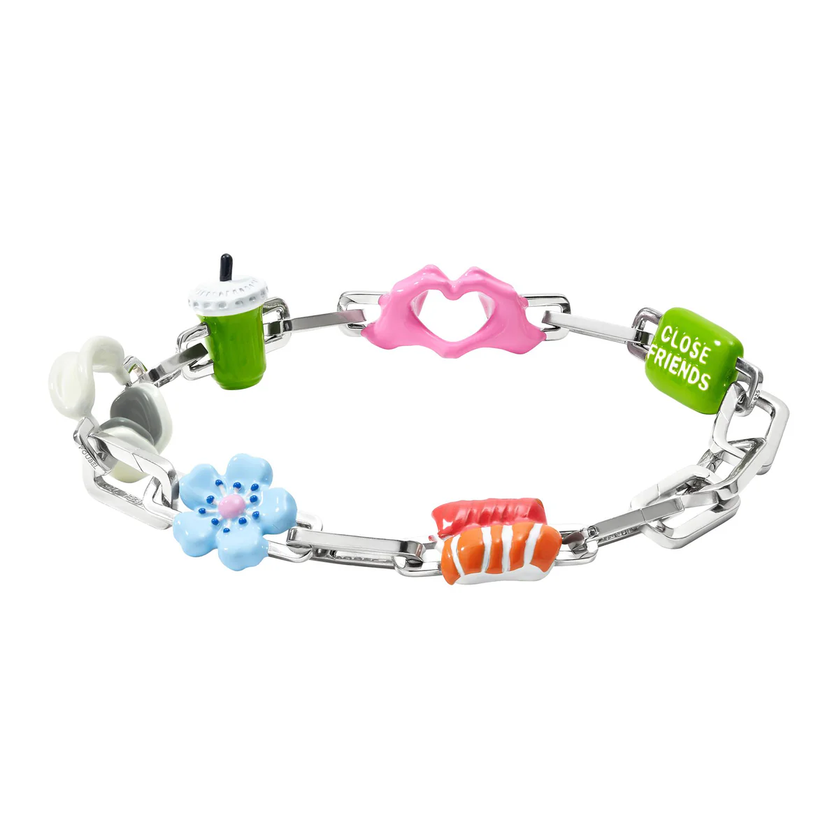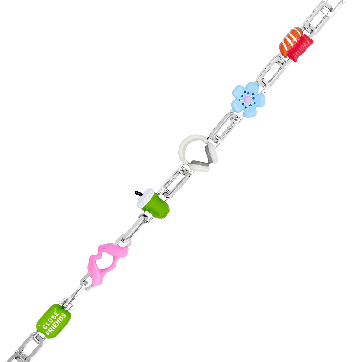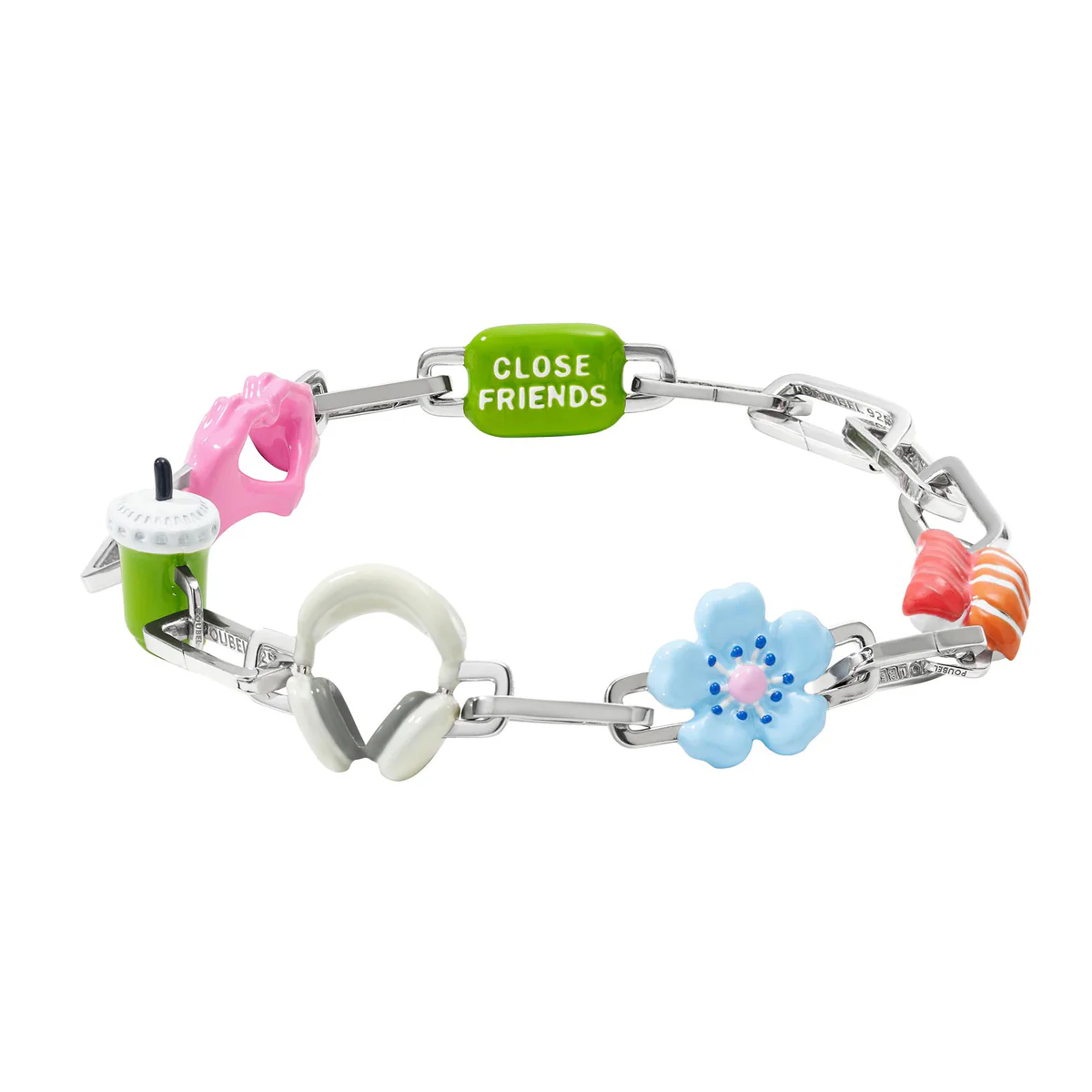 Звенья Poubel изготовлены из переработанного, покрытого родием стерлингового серебра, состоящего на 92,5% из чистого серебра и на 7,5% из других металлов. Добавление других металлов делает цепочку более прочной, не влияя при этом на цвет или блеск.