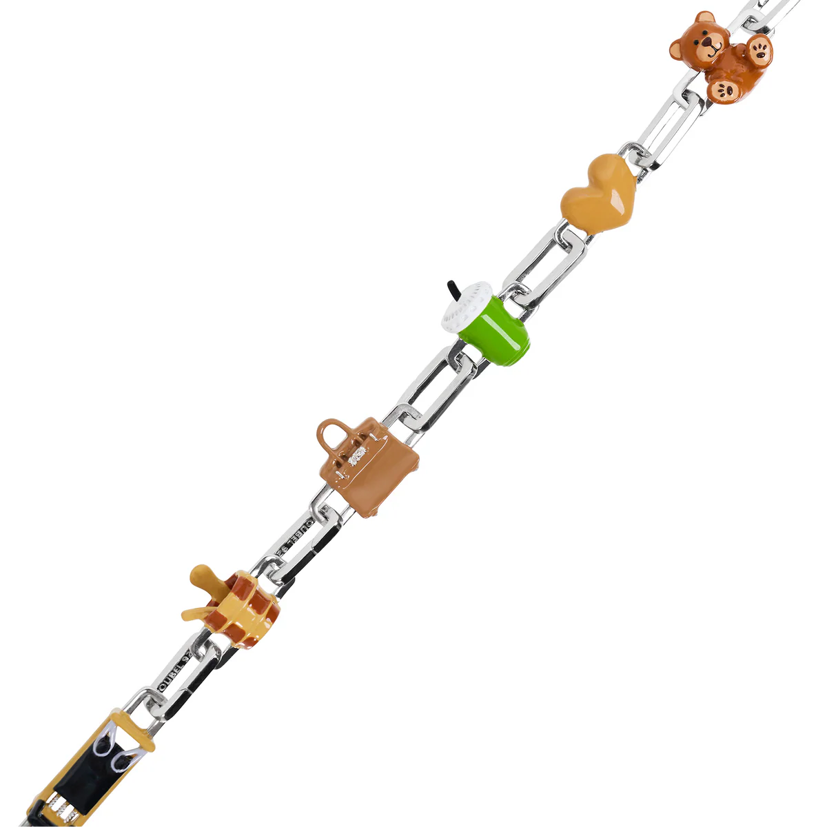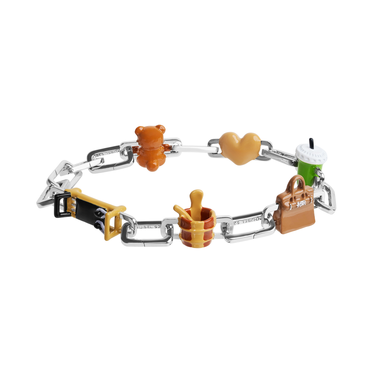 Звенья Poubel изготовлены из переработанного, покрытого родием стерлингового серебра, состоящего на 92,5% из чистого серебра и на 7,5% из других металлов. Добавление других металлов делает цепочку более прочной, не влияя при этом на цвет или блеск.