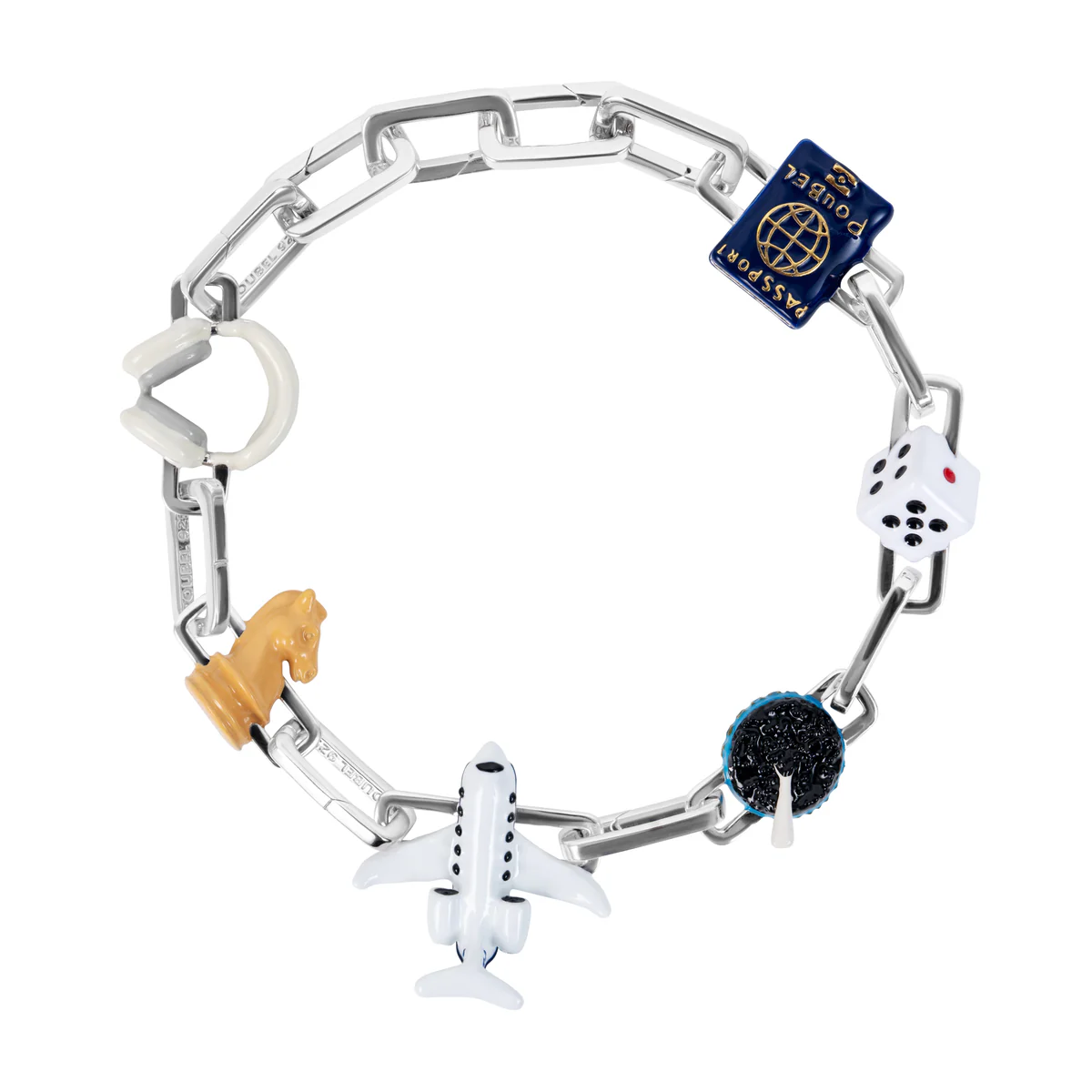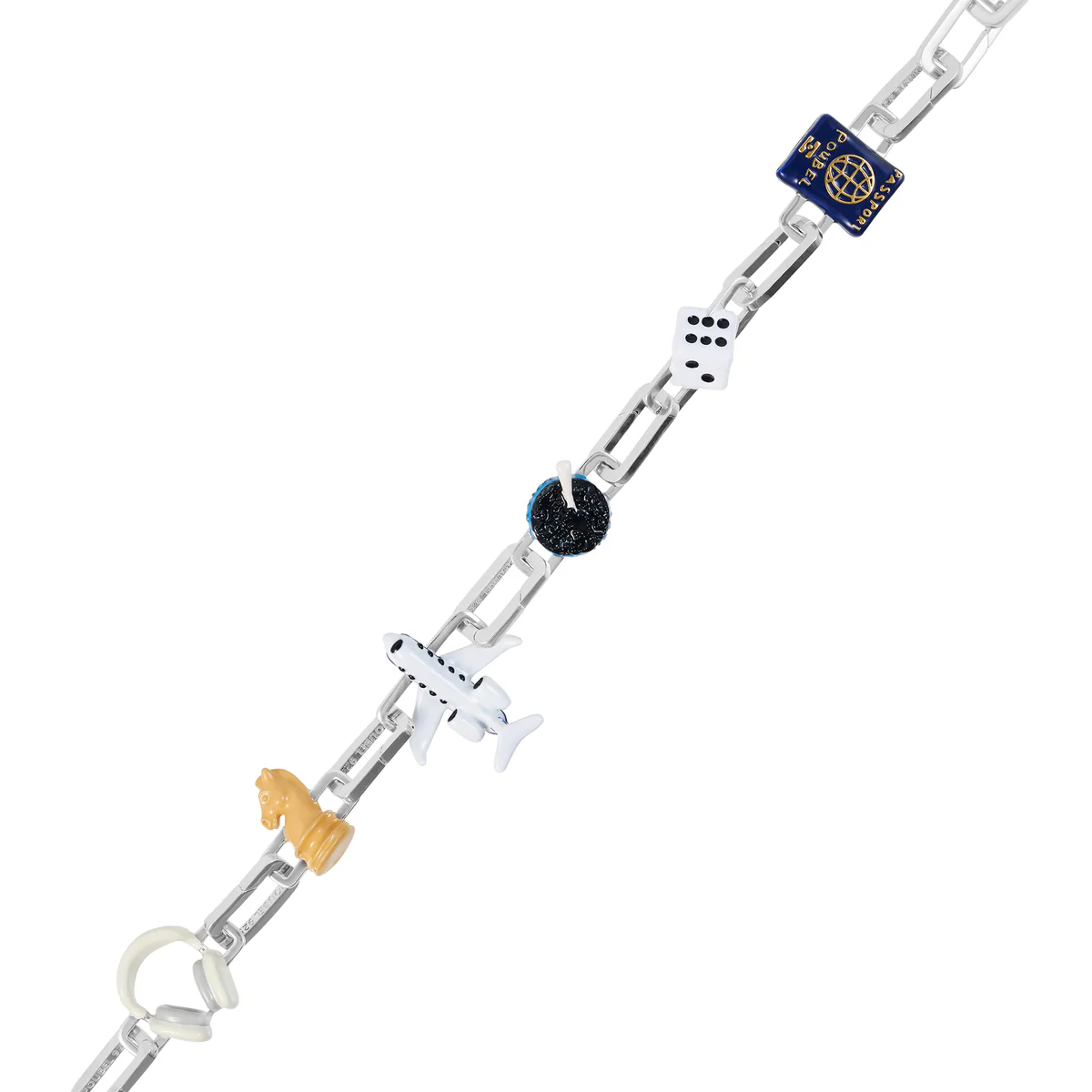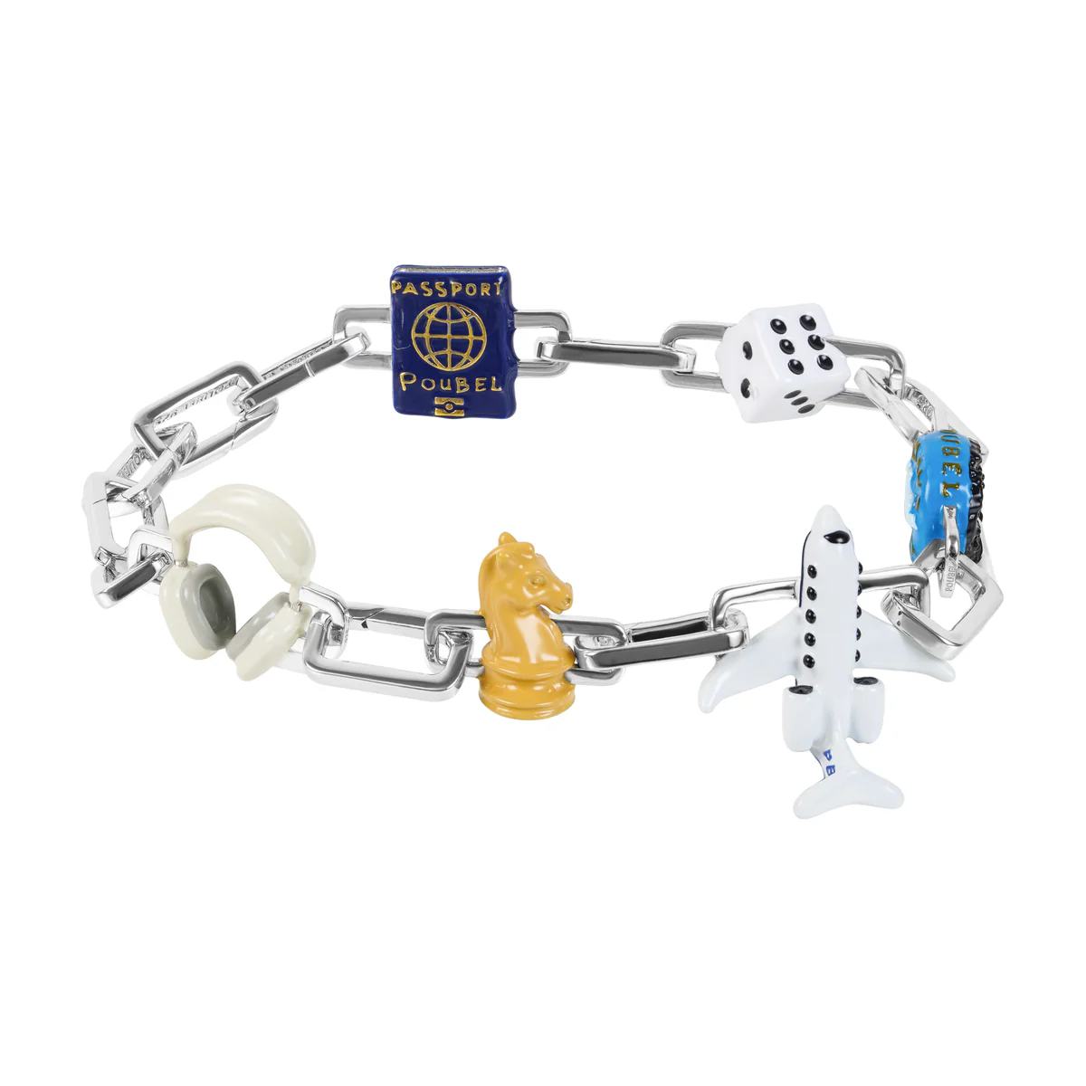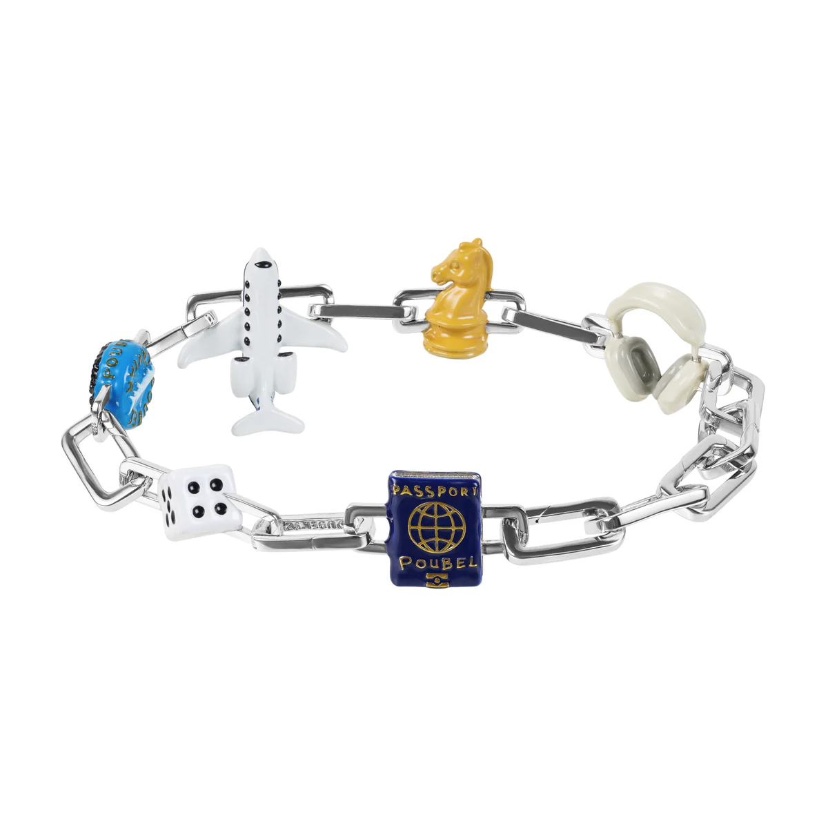 Звенья Poubel изготовлены из переработанного, покрытого родием стерлингового серебра, состоящего на 92,5% из чистого серебра и на 7,5% из других металлов. Добавление других металлов делает цепочку более прочной, не влияя при этом на цвет или блеск.