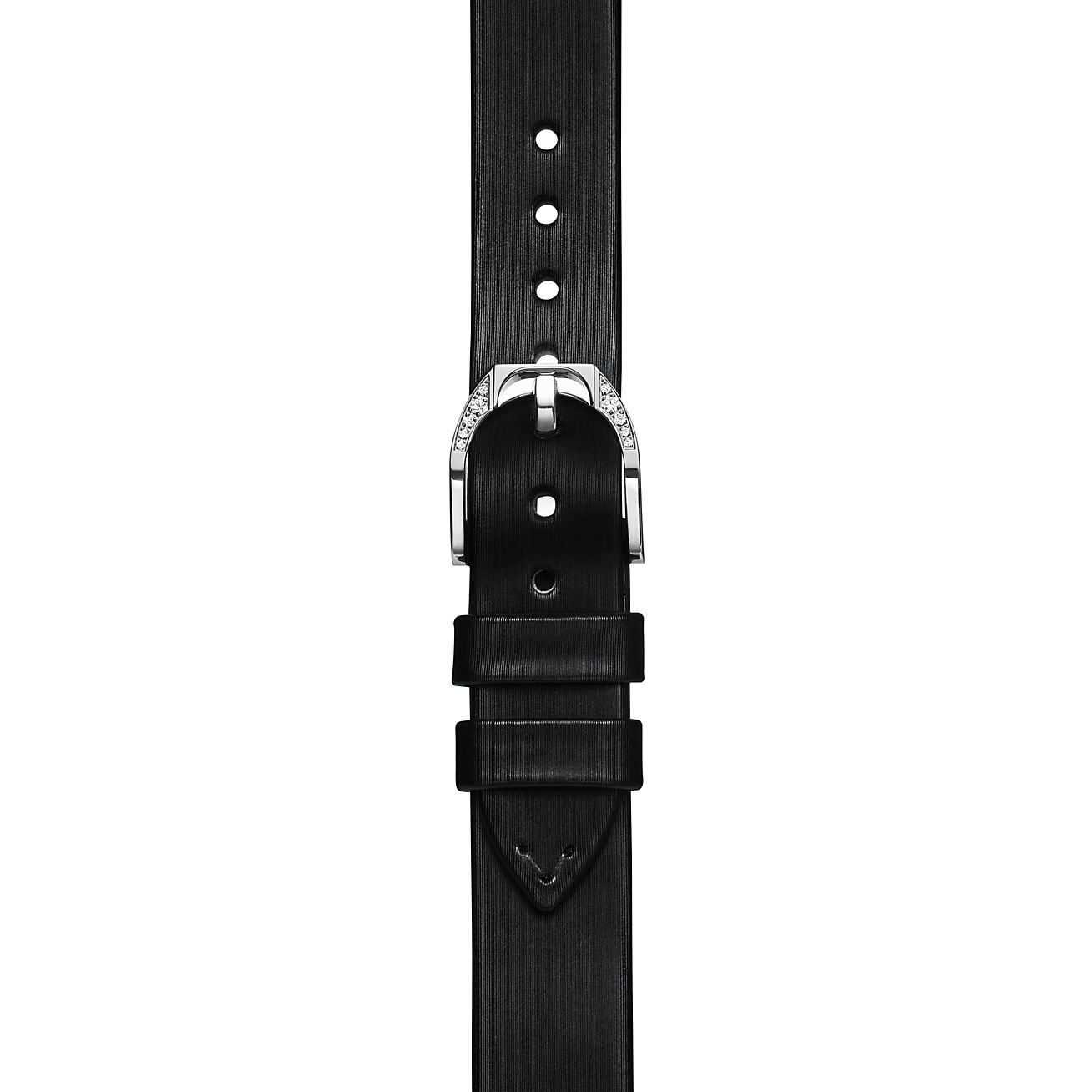 Ремешок из черной телячьей кожи дополнен пряжкой из белого золота, инкрустированной 10 бриллиантами. Общий вес бриллиантов — 1,48 карата.