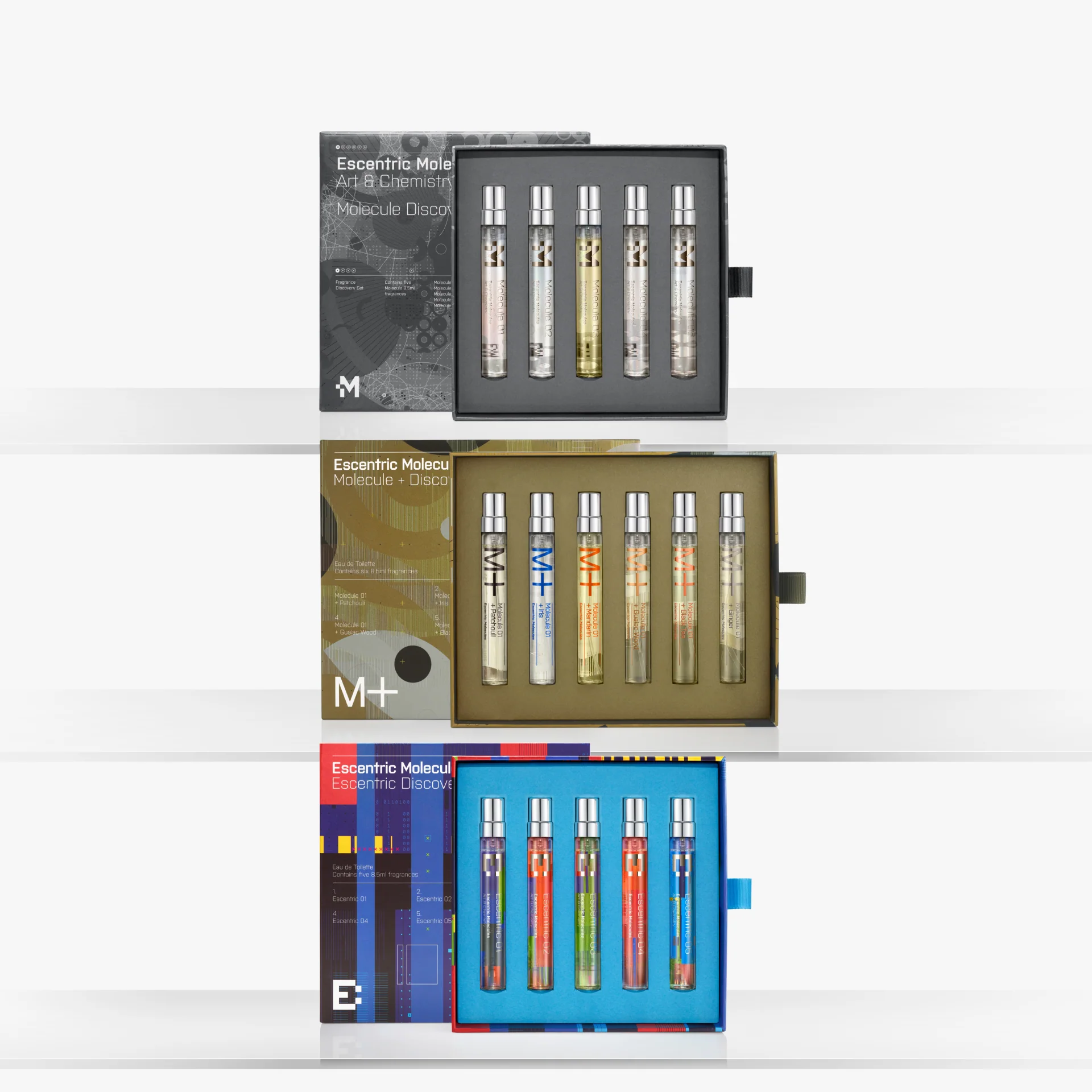 Созданный для настоящих исследований, этот набор позволит получателю изучить ароматы Molecule, Escentric и M+, прежде чем определить свой идеальный аромат. Парфюм заключен в миниатюрные флаконы объемом 8,5 мл — идеальный размер для знакомства с миром Escentric Molecules и утоления любой парфюмерной потребности.
