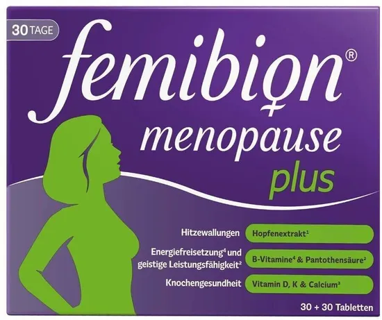 Фемибион® Менопауза Плюс — это пищевая добавка для женщин в период менопаузы, которая не содержит гормонов. В упаковке Фемибион® Менопауза Плюс содержатся таблетки экстракта хмеля, которые помогают женщинам справиться с приливами жара 1 , а также таблетки с поливитаминно-минеральным комплексом, которые содержат витамины группы B для снижения усталости и усталости 5 , пантотеновую кислоту и цинк для поддержания умственной работоспособности 2 и нормальной когнитивной функции 6 , а также витамины D, K и кальций для поддержания нормальных костей 3 .