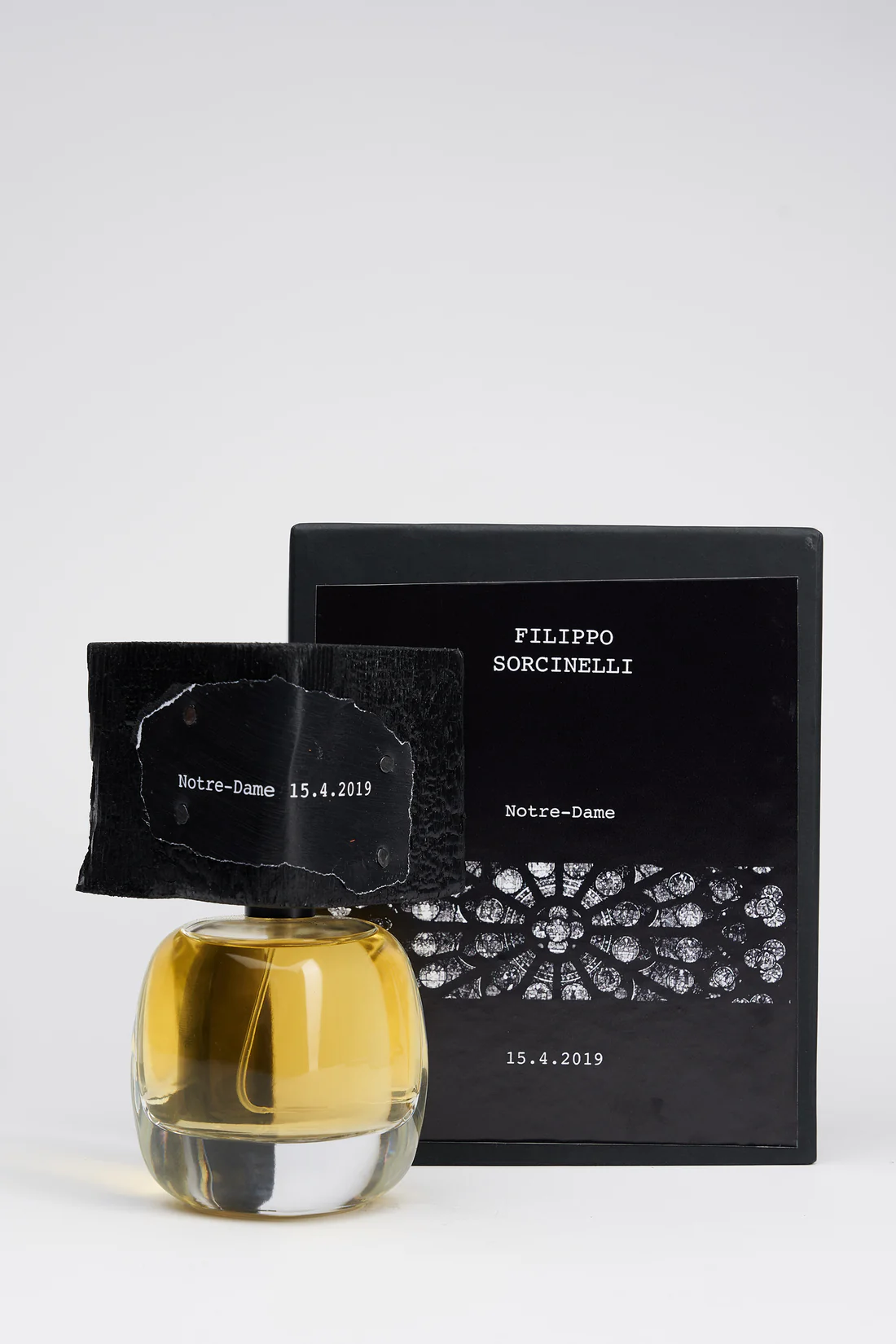 Как всегда, особое внимание уделено упаковке: крышка флакона представляет собой монолит из обожжённого дерева, отсылающий к трагическому моменту пожара, на котором выбито название аромата. При открытии появляются характерные четыре опадающих «крыла», расписанные и подписанные непосредственно Филиппо Сорчинелли символами, цветами и стилистическими элементами, отсылающими к Парижскому собору: четыре настоящие маленькие «картины», которые складываются в единое истинное и эксклюзивное произведение искусства.