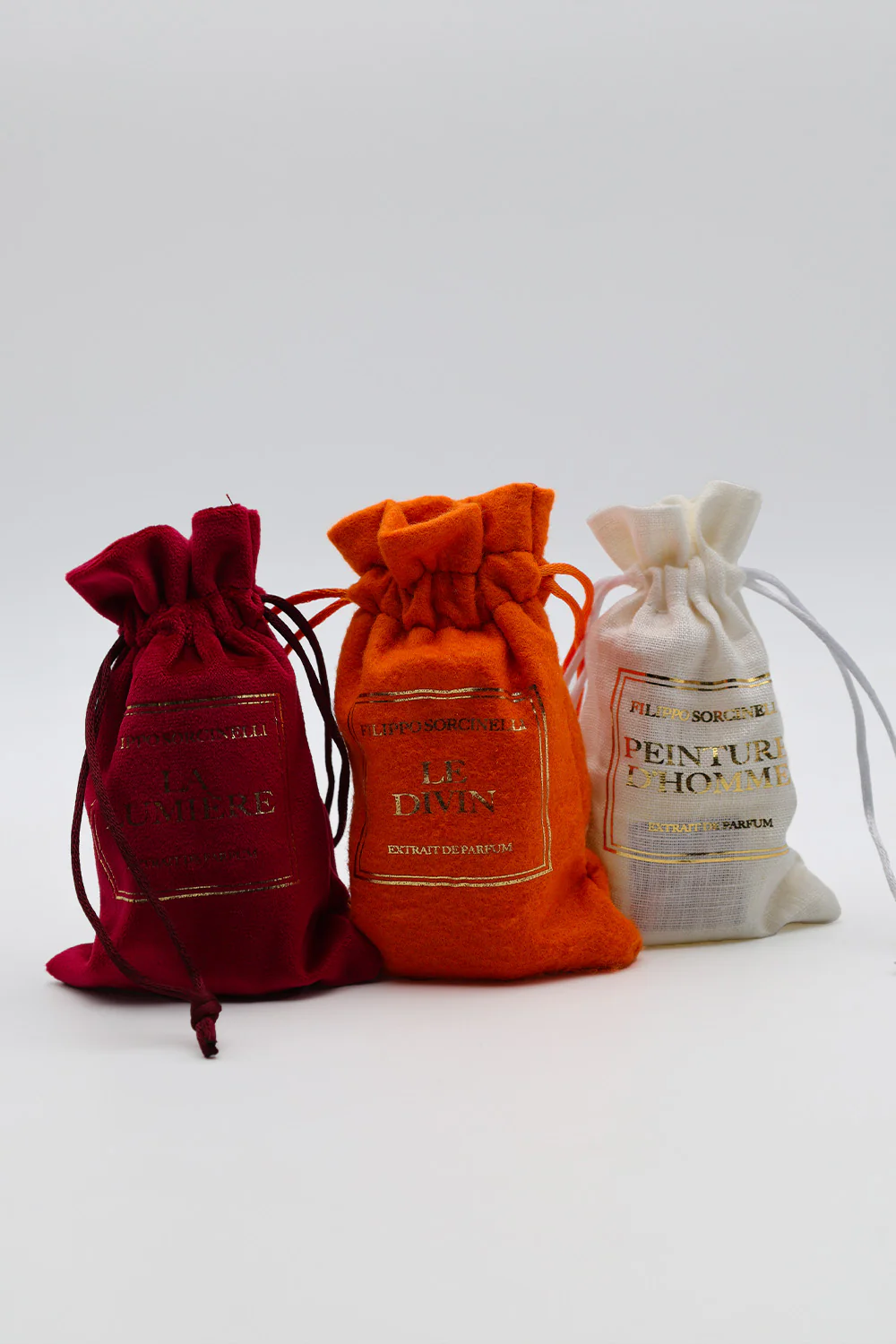 Коробка с парфюмом, имитирующая мрамор, содержит три маленьких мешочка. Сначала она говорит через зрение и осязание.