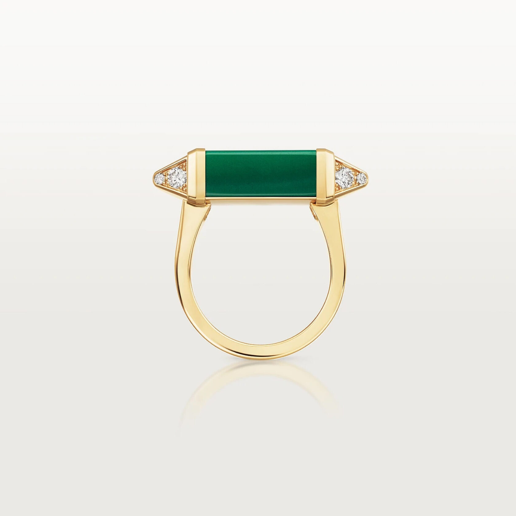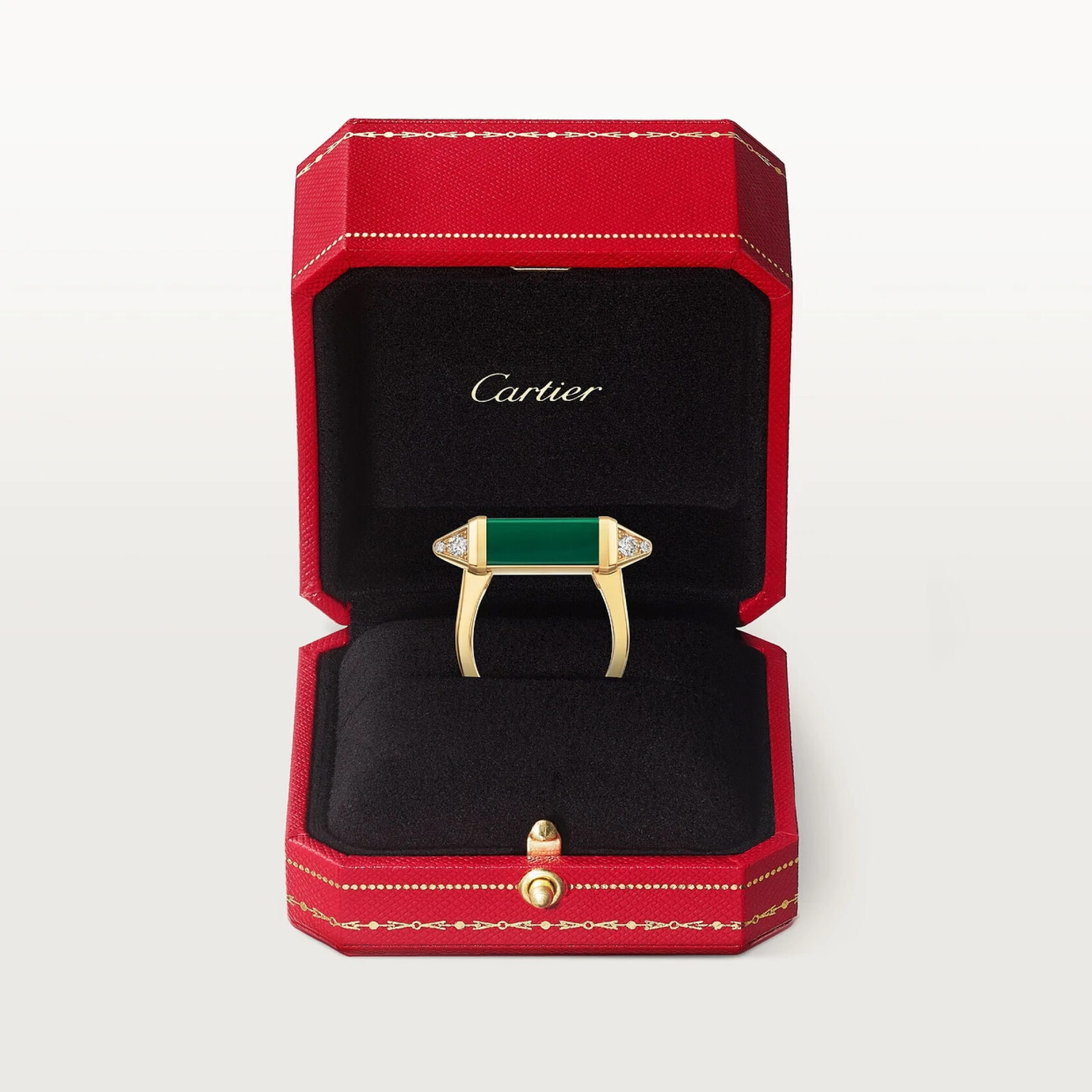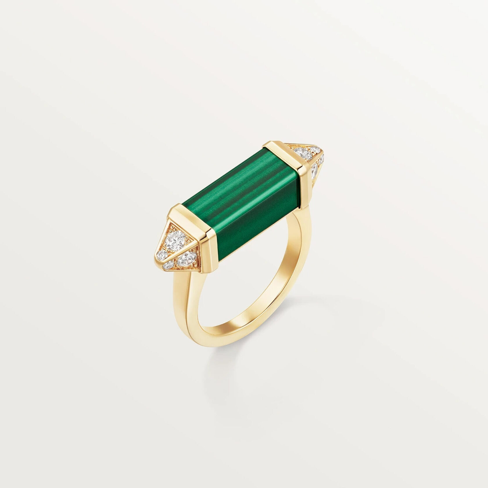Элегантное кольцо из коллекции Les Berlingots de Cartier выполнено из желтого золота 750 пробы и украшено изысканным малахитом. 12 бриллиантов классической круглой огранки, общей массой 0,33 карата (для размера 52), придают кольцу дополнительную роскошь и блеск. Это уникальное украшение идеально сочетает в себе силуэт, вдохновленный стилем арт-деко, и современные элементы ювелирного искусства. Эта модель станет прекрасным выбором для тех, кто ценит элегантность и оригинальность в ювелирных украшениях.