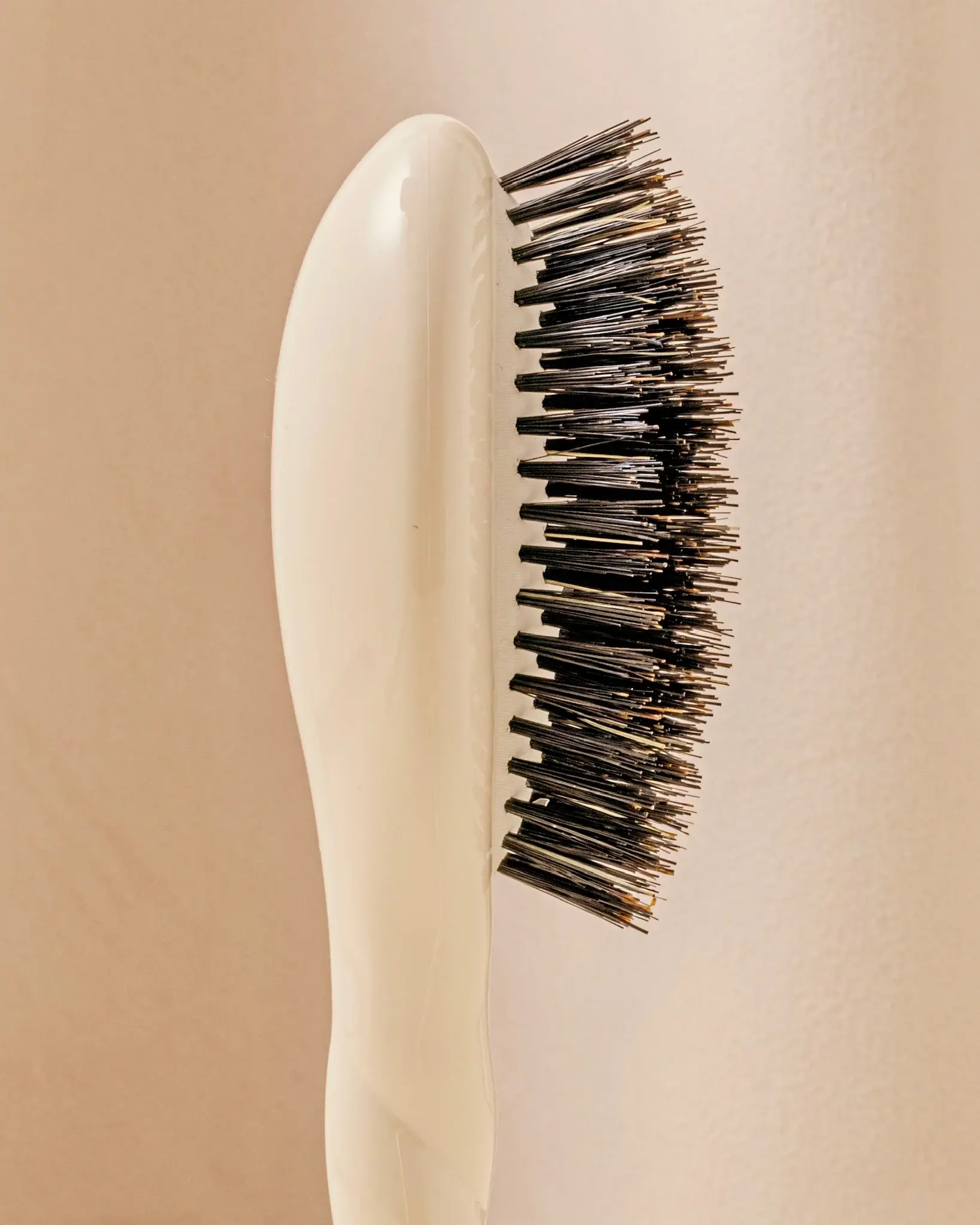 Щетка из щетины кабана, богатой кератином, бережно распределяет натуральные масла от корней по всей длине волос, обеспечивая мгновенное и долговременное увлажнение и естественное сияние.