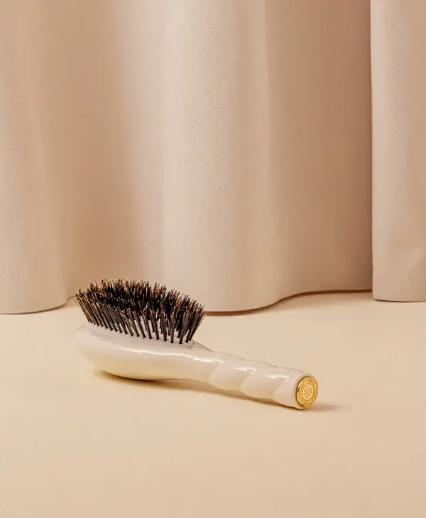 Щетка из щетины кабана, богатой кератином, бережно распределяет натуральные масла от корней по всей длине волос, обеспечивая мгновенное и долговременное увлажнение и естественное сияние.