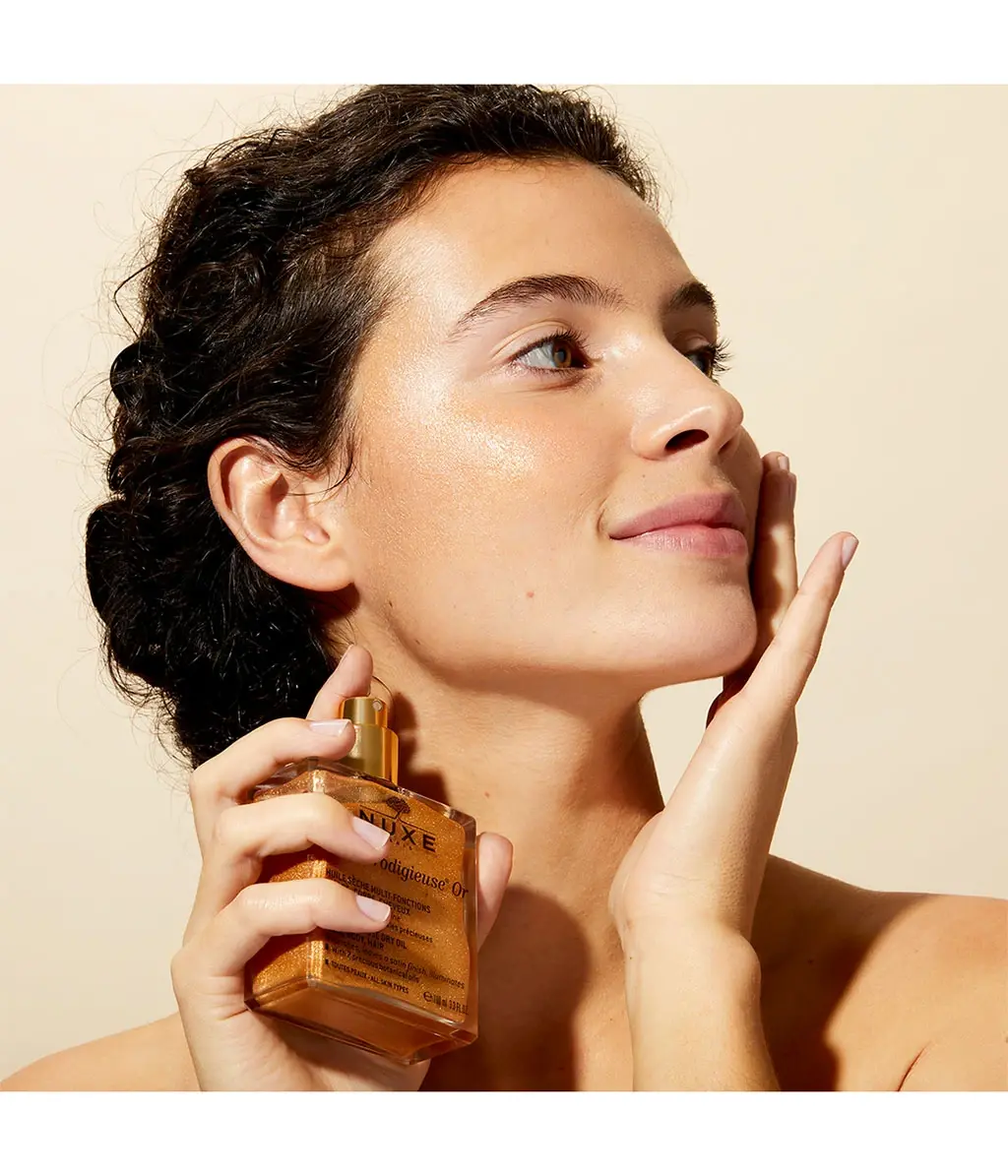 Мерцающая версия сухого масла Huile Prodigieuse® питает и придает коже и волосам эластичность а также создает идеальное сияние благодаря мельчайшим минеральным перламутровым частицам.