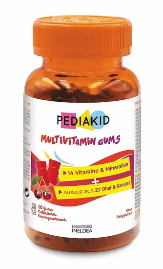 Мультивитамины PEDIAKID содержит 14 витаминов и минералов в форме мармеладных мишек из 22 видов фруктов и овощей. Мультивитамины PEDIAKID® богаты витаминами A, C, E, K, B1, B2, B3, B5, B6, B8, B9, B12, селеном и цинком, поддерживают и способствуют оптимальному функционированию иммунной и нервной систем, уменьшают усталость. Жевательные конфеты не содержат желатина, консервантов, глютена, лактозы, искусственных красителей и ароматизаторов. Они изготовлены из яблочного пектина и содержат вкусный натуральный аромат апельсина и вишни. Упаковка содержит 60 мармеладных медведей.