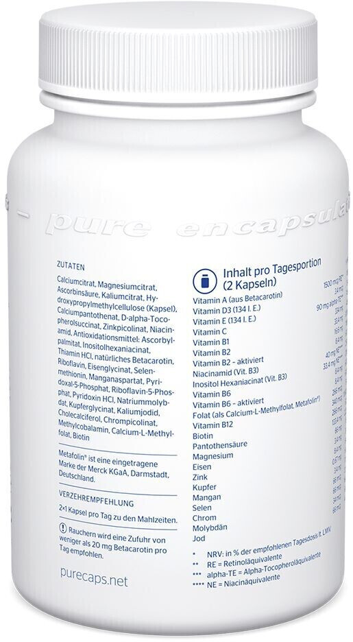 цитрат кальция, цитрат магния, аскорбиновая кислота, цитрат калия, гидроксипропилметилцеллюлоза (капсула), пантотенат кальция, сукцинат D-альфа-токоферола, пиколинат цинка, ниацинамид, антиоксиданты: аскорбил пальмитат, инозитол гексаниацинат, тиамин HCl, натуральный бета-каротин. , рибофлавин, глицинат железа, метионин селена, партат марганца, пиридокс аль-5-фосфат, рибофлавин 5-фосфат, пиридоксин гидрохлорид, молибдат натрия, глицинат меди, йодид калия, холекальциферол, пиколинат хрома, метилкобаламин, L-метилфолат кальция, биотин.