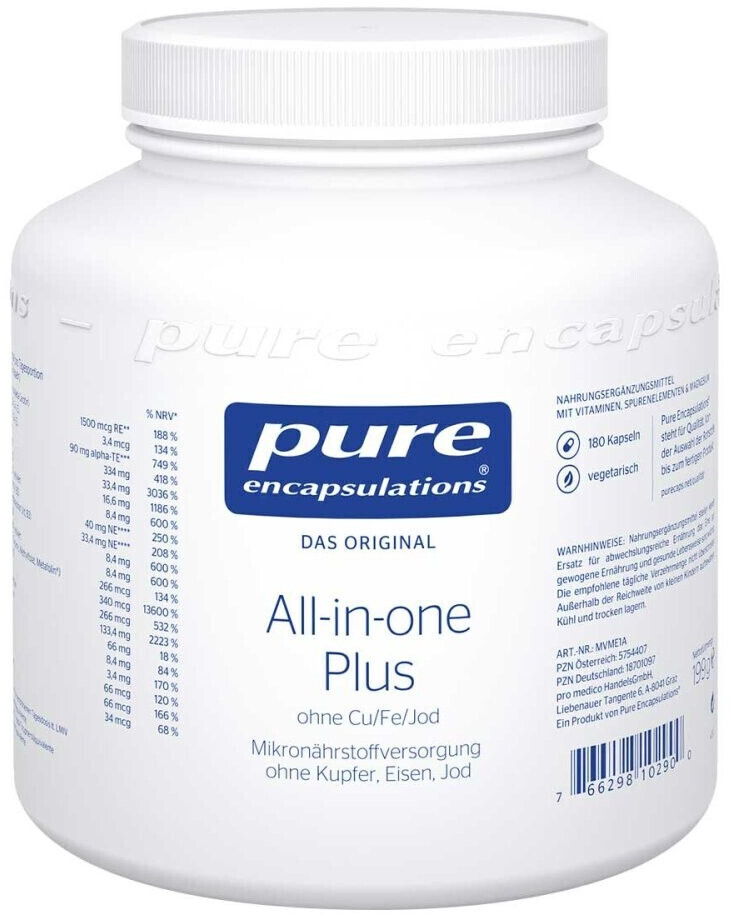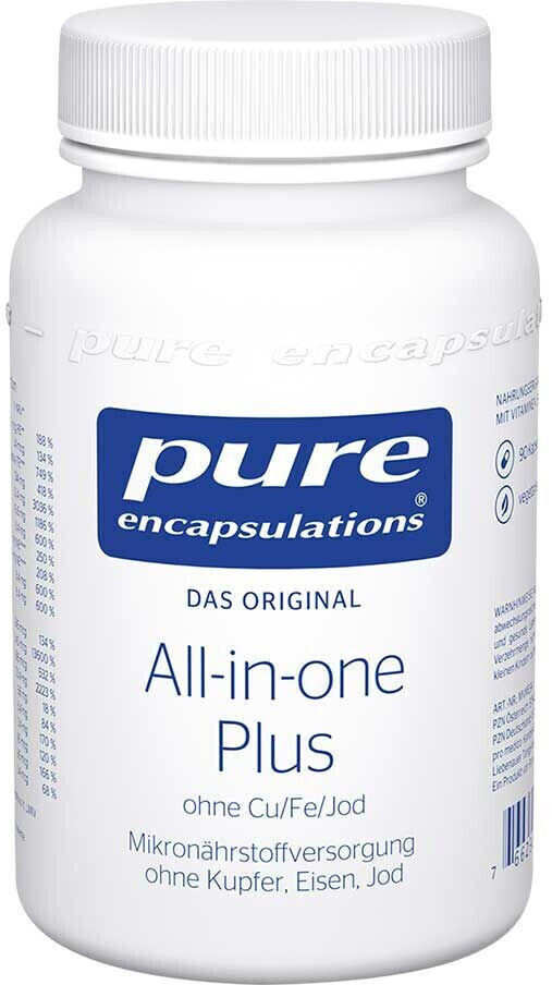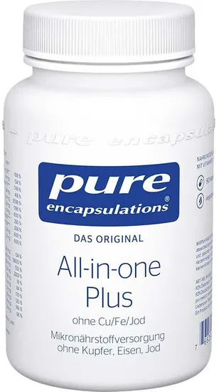 Pure Encapsulations® All-in-one Plus (без меди/железа/йода) содержит обширный спектр витаминов и минералов. Использование идентичных натуральным соединений гарантирует несравненно высокое усвоение (биодоступность) микроэлементов. Гипоаллергенный состав обеспечивает максимальную переносимость. Поскольку в составе нет йода, пищевая добавка подходит для людей, которым необходимо избегать йода в пище.