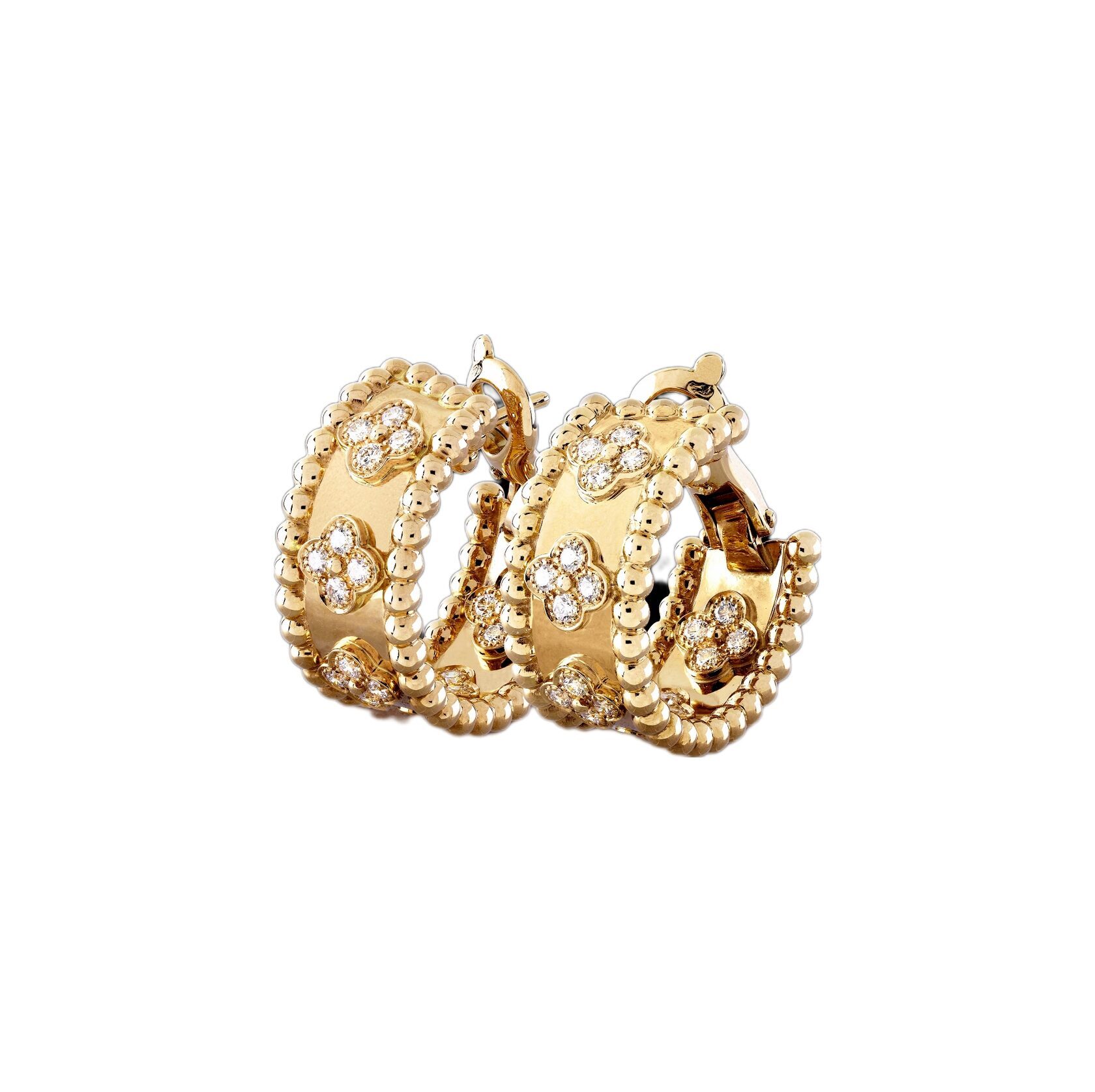 Элегантные серьги-кольца Perlee Clovers Van Cleef & Arpels из 18-каратного золота. Произведения из коллекции Perlee clovers украшены драгоценными мотивами в форме четырехлистника – символа удачи Van Cleef & Arpels. Каждый из них венчает золотая бусинка. Украшены 40 круглыми бриллиантами высочайшего качества от IF до VVS общим весом 0,62 карата. Изысканные серьги-кольца Van Cleef & Arpels - роскошный ювелирный аксессуар, сочетающий в себе элегантность, утонченность и инновационные технологии. Идеально подходят как для повседневного, так и для вечернего образа.