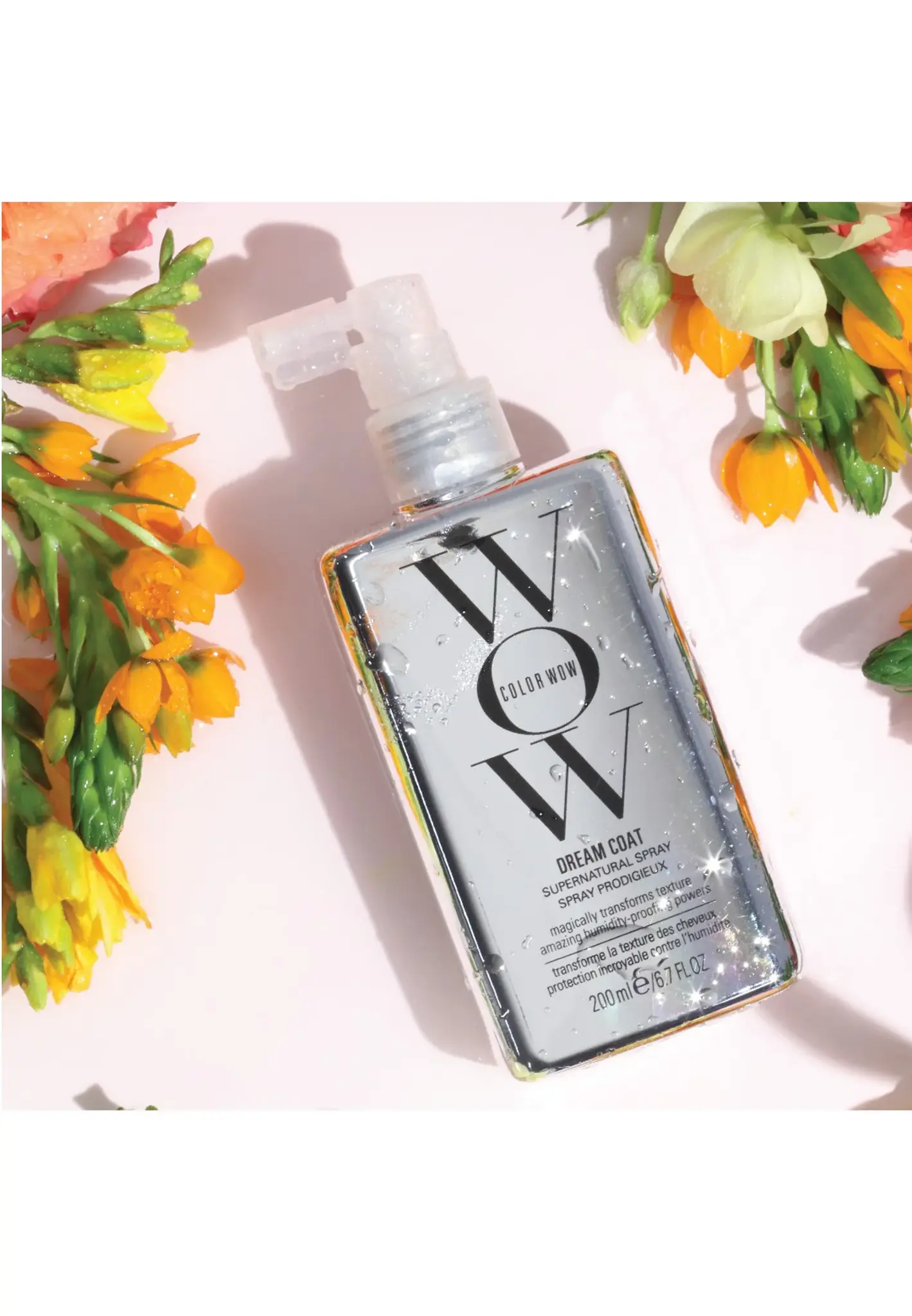 Вымойте волосы шампунем (дополнительно можно использовать кондиционер). Разделите подсушенные полотенцем волосы на пряди и равномерно нанесите Color WOW Dream Coat Supernatural на расстоянии 15 см от волос. Не используйте других средств для укладки! Высушите каждую прядь феном, одновременно используя круглую щетку для вытягивания волос. Использование фена является необходимым этапом активации продукта. Влагостойкая формула спрея Dream Coat держится 72 часа. Нанесите повторно через 2-3 мытья волос шампунем.